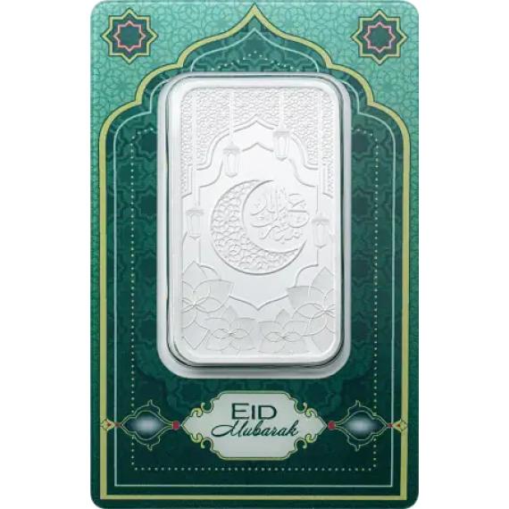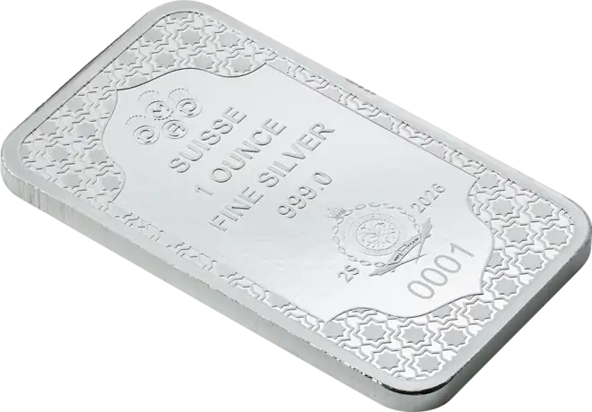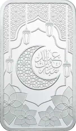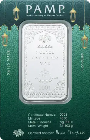 1 oz stříbrný slitek | PAMP | Eid Mubarak Objevte nadčasovou hodnotu stříbra s 1oz stříbrným slitkem | PAMP | Eid Mubarak. Tyto pečlivě vyrobené slitky z ryzího stříbra 999/1000 představují eleganci a bezpečí. Tyto 31,1035g stříbrné slitky, vyrobené jednou z nejdůvěryhodnějších rafinérií, PAMP Switzerland, jsou ideální pro investory, kteří chtějí diverzifikovat nebo rozšířit své portfolio drahých kovů. 1 oz stříbrný slitek | PAMP | Specifikace k svátku Eid Mubarak: Mincovna : PAMP Švýcarsko Kov : Stříbro (ryzost: 999/1000) Typ produktu: slitky Série: slitky PAMP Země původu: Švýcarsko hmotnost  : 31,1035 g Balení produktu : Dodáváno v kartě CertiPAMP™ a dárkovém obalu pro zajištění maximální ochrany.